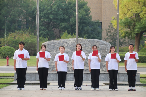 在庄严的国歌声中,五星红旗冉冉升起。在场师生大声高唱国歌并向国旗行注目礼,表达着对祖国的无限热爱和崇高敬意。