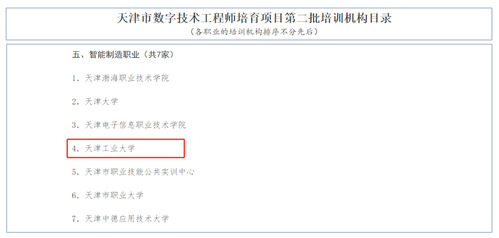 2023年9月28日,天津市人力资源和社会保障局下发了《关于公布天津市数字技术工程师培育项目第二批培训机构目录的通知》,机械工程学院牵头申报的智能制造职业培训资质顺利通过,有效期三年。