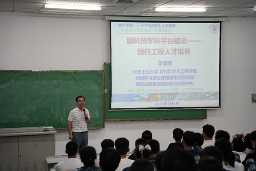 2023年9月4日和9月5日晚,李建新教授为2023级全体本科新生作了题为《膜科技学科平台建设——践行工程人才培养》的精彩讲座。李建新教授以问题开篇,启发学生思考“材料专业的广度、深度和高度”。他介绍了膜科技学科优质的平台和资源,分享了团队中的优秀学长学姐,并以此激励新生,引导新生培养责任心,发展心智,抵制诱惑、拒绝平庸、激发兴趣、专注学业,坚持体育锻炼,学会表达,培养思维能力、领导力和团队合作能力等。