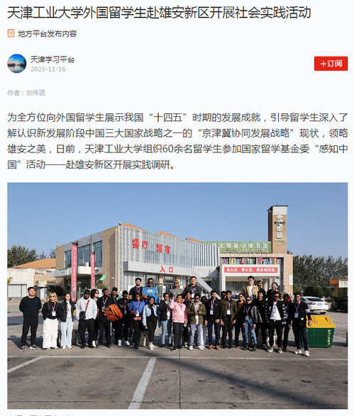 此次走进雄安新区社会实践活动作为“感知中国”系列活动的重要内容,有助于外国留学生更好地了解中国,为讲好中国故事、传播好中国声音,持续打造“天工国际”品牌发挥积极作用。天津工业大学将以此次参加“感知中国”活动为契机,不断创新来华留学国情教育体系,丰富活动内涵,为推动构建人类命运共同体贡献力量。(作者单位:天津工业大学)