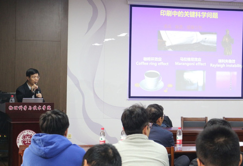 宋延林研究员首先分享了通过液滴操控实现超高精度图案化的新策略,精准解决影响印刷精度的难题,相关技术极大地突破了印刷制造的精度极限。随后,宋延林研究员对所建纳米尺度“点、线、面、体”结构在各类柔性电子器件制备上的应用进行了阐述,让与会师生切实感受到现代印刷技术“绿色化、功能化、立体化、器件化”的发展趋势和格局。报告会结束后,参会的各位老师和同学积极提问,与宋延林老师进行了深入地讨论交流。