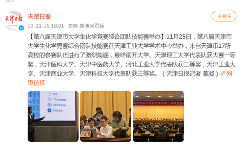 第八届天津市大学生化学竞赛综合团队技能赛举办 【第八届天津市大学生化学竞赛综合团队技能赛举办】11月25日,第八届天津市大学生化学竞赛综合团队技能赛在天津工业大学学术中心举办,来自天津市17所高校的参赛队伍进行了激烈角逐,最终南开大学、天津理工大学代表队获大赛一等奖,天津医科大学、天津中医药大学、河北工业大学代表队获二等奖,天津工业大学、天津商业大学、天津科技大学代表队获三等奖。(天津日报记者 姜凝)
