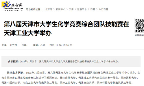 天津北方网讯:2023年11月25日,第八届天津市大学生化学竞赛综合团队技能赛在天津工业大学学术中心举办。在来自天津市17所高校的参赛队伍进行了激烈角逐,最终南开大学、天津理工大学代表队获大赛一等奖,天津医科大学、天津中医药大学、河北工业大学代表队获二等奖,天津工业大学、天津商业大学、天津科技大学代表队获三等奖。