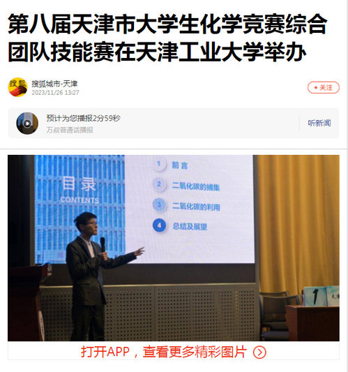 天津工业大学化学学院副院长臧洪俊教授介绍,本次团队赛课题展示以“直接空气捕集CO2技术”为主题,紧贴时代前沿,充分体现了绿色低碳发展思想,有助于推动“双碳战略”创新发展,培育青年科技创新人才。她表示,本次竞赛中各参赛队思想重视、准备充分、团结拼搏,进一步激发了大学生对学习化学基础知识的热情,增强了团队合作精神,展示了新时代大学生的青春风采。