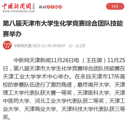 中新网天津新闻11月26日电 (王在御)11月25日,第八届天津市大学生化学竞赛综合团队技能赛在天津工业大学学术中心举办。在来自天津市17所高校的参赛队伍进行了激烈角逐,最终南开大学、天津理工大学代表队获大赛一等奖,天津医科大学、天津中医药大学、河北工业大学代表队获二等奖,天津工业大学、天津商业大学、天津科技大学代表队获三等奖。
