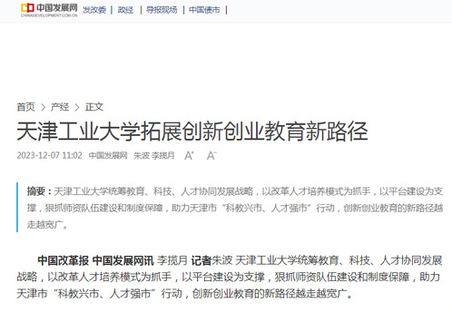 中国改革报 中国发展网讯 李揽月 记者朱波 天津工业大学统筹教育、科技、人才协同发展战略,以改革人才培养模式为抓手,以平台建设为支撑,狠抓师资队伍建设和制度保障,助力天津市“科教兴市、人才强市”行动,创新创业教育的新路径越走越宽广。