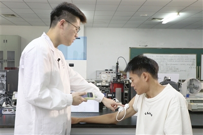 图片新闻图为科研人员测试刺激仪。天津工业大学纺织学院智能可穿戴研究所刘皓教授团队研制的神经肌肉刺激仪,日前进入收尾阶段,可应用于缓解运动后肌肉疲劳、疼痛,改善睡眠质量等方面。 本报记者 姜宝成 通讯员 高泽宇 摄
