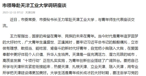 近日,市委常委、市委秘书长王力军赴天津工业大学,与青年师生代表座谈交流。