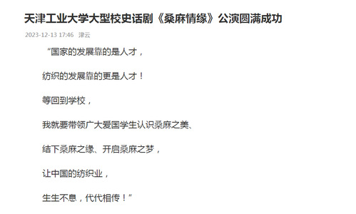 该话剧的成功公演,增进了广大师生对学校历史、学校精神的了解,激发了师生爱校荣校的情感,成为学校文化建设、美育工作开展的一张靓丽品牌。天津工业大学团委负责人介绍到,学校将做好对该剧的宣传推广,进一步唱响天工声音,助力学校一流文化传承创新,为建设高等教育强国、实现中华民族伟大复兴作出新的更大的贡献。(天津日报记者 姜凝)