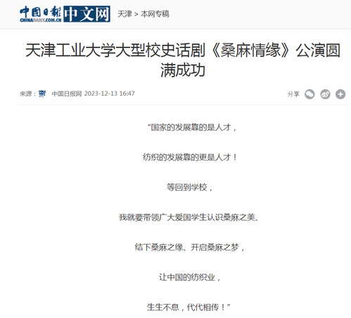 2023年12月11日、12日晚,天津工业大学大型校史话剧《桑麻情缘》公演圆满成功。这部跨越一个世纪、讲述一批先驱故事、绘就一段历史佳话的校史剧,以戏剧艺术形式表达了天工人的爱国情与桑麻情缘。