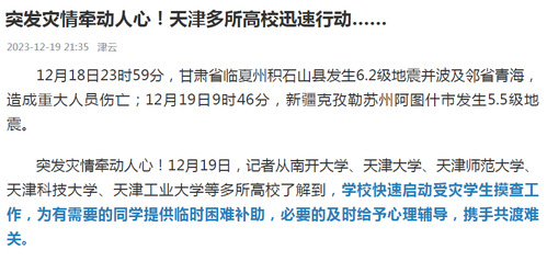 12月19日早晨闻讯后,天津师范大学立即启动应灾帮扶工作,迅速开展全覆盖摸排,深入了解排查生源地为甘肃、青海、新疆受地震灾害影响地区的学生家庭受灾情况,形成全校台账;组建专项工作组,针对受灾家庭学生“一生一策”确定紧急帮扶措施,快速发放临时困难补助;辅导员队伍加强谈心谈话,保持家校联系联动,疏导学生情绪,关心关爱学生及其家属情况。截至目前,该校生源地为此次地震灾区的学生中,直系亲属无人员伤亡情况;有家庭房屋受损者,学校已及时下发临时困难补助金,确保不让学生因牵挂家乡灾情而影响学业。