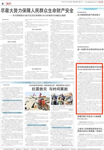 本报讯(记者 姜凝)12月18日23时59分在甘肃临夏州积石山县发生6.2级地震并波及邻省青海,12月19日9时46分在新疆克孜勒苏州阿图什市发生5.5级地震。突发灾情牵动人心。昨天记者从南开大学、天津大学、天津师范大学、天津财经大学等多所高校了解到,学校快速启动受灾学生摸查工作,为有需要的同学提供临时困难补助,必要时给予心理辅导。