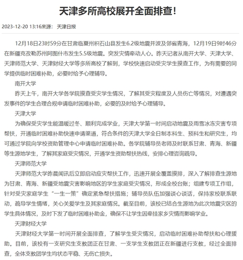 12月18日23时59分在甘肃临夏州积石山县发生6.2级地震并波及邻省青海,12月19日9时46分在新疆克孜勒苏州阿图什市发生5.5级地震。突发灾情牵动人心。昨天记者从南开大学、天津大学、天津师范大学、天津财经大学等多所高校了解到,学校快速启动受灾学生摸查工作,为有需要的同学提供临时困难补助,必要时给予心理辅导。