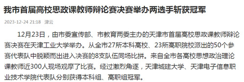12月23日,由市委宣传部、市教育两委主办的天津市首届高校思政课教师辩论赛决赛在天津工业大学举办。从全市27所本科高校、23所高职院校派出的50个参赛代表队中脱颖而出进入决赛的8支队伍同场比拼。来自全市各高校思想政治理论课教师近300人现场观摩了比赛。经过激烈角逐,天津城建大学、天津电子信息职业技术学院代表队分别获得本科组、高职组冠军。