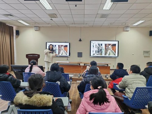 交流会前,昆明路小学师生参观了天津工业大学红色文化研究与教育基地。交流会期间,学院“红色星火”学生理论宣讲团党海盼同学给到访的小学生代表结合自己贵州支教经历讲授了一堂精彩的微思政课。