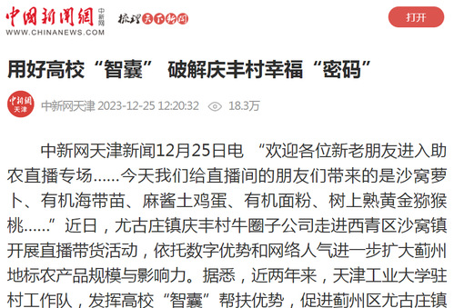 中新网天津新闻12月25日电 “欢迎各位新老朋友进入助农直播专场……今天我们给直播间的朋友们带来的是沙窝萝卜、有机海带苗、麻酱土鸡蛋、有机面粉、树上熟黄金猕猴桃……”近日,尤古庄镇庆丰村牛圈子公司走进西青区沙窝镇开展直播带货活动,依托数字优势和网络人气进一步扩大蓟州地标农产品规模与影响力。据悉,近两年来,天津工业大学驻村工作队,发挥高校“智囊”帮扶优势,促进蓟州区尤古庄镇庆丰村经济薄弱村紧跟乡村振兴步伐,奋力开创全面推进乡村振兴新局面,实现高质量发展。
