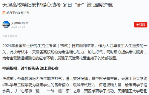 2024年全国硕士研究生招生考试(初试)日前顺利结束。作为大四毕业生人生重要的一关,此次考试中,天津各高校纷纷为考生暖心助力、加油打气,同时细心提供考试服务,为考生营造温暖贴心的应考环境,展现了天津高校爱生如子的浓郁氛围。