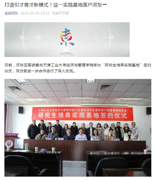 日前,河东区国资委与天津工业大学经济与管理学院举办“研究生培养实践基地”签约仪式,双方就进一步合作进行了深入交流。