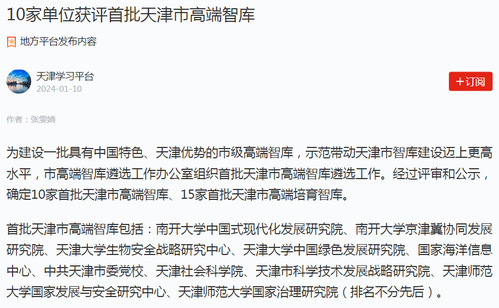 为建设一批具有中国特色、天津优势的市级高端智库,示范带动天津市智库建设迈上更高水平,市高端智库遴选工作办公室组织首批天津市高端智库遴选工作。经过评审和公示,确定10家首批天津市高端智库、15家首批天津市高端培育智库。