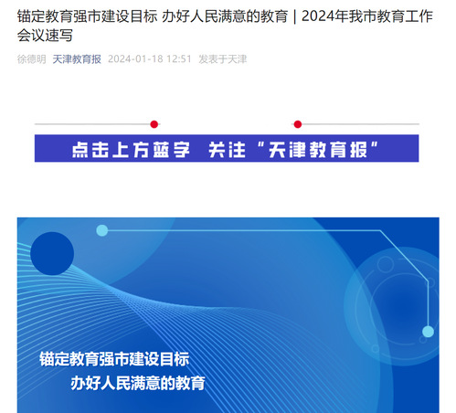 谋深做实,率先部署。1月17日,天津市2024年度教育工作会议在天开高教科创园召开。会议指出,坚持以习近平新时代中国特色社会主义思想为指导,深入贯彻党的二十大精神,全面贯彻党的教育方针,落实立德树人根本任务,锚定教育强市建设目标,系统推进教育综合改革,深入实施高质量发展“十项行动”,加快建设高质量教育体系,办好人民满意的教育,为全面建设社会主义现代化大都市提供基础性、战略性支撑。