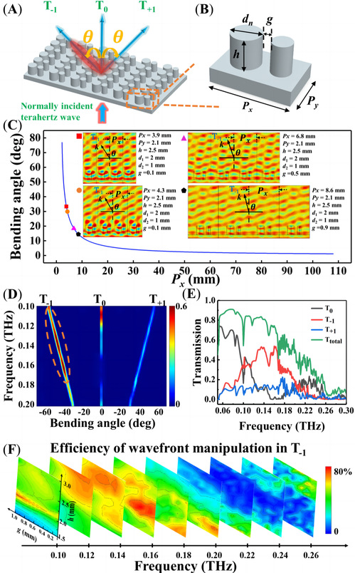 石嘉副教授的论文设计了一种非对称散射模式衍射光栅超构器件,通过阵列超构光栅调控自由空间衍射场分布,实现了太赫兹波的角度偏转和能量分配。所设计的超构光栅在0.14 THz中心频率下,能够将入射能量高效聚集于特定衍射阶次,并抑制其他衍射阶次能量。器件制备采用常见的商用光敏树脂作为介电材料,该材料在6G太赫兹通信窗口具有较低的损耗。如图1所示,数值模拟表明,该超构光栅阵列在0.10至0.18 THz范围内具有优异的调控效率。