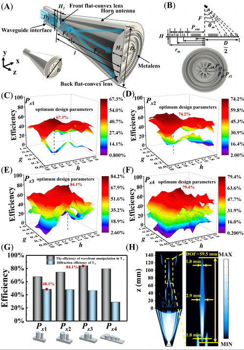 基于多尺度超构光栅阵列,论文还提出了空间约束下一体化6G太赫兹超构天线设计方法,实现了超衍射极限空间探测感知。该超构天线集成了波导接口、扩束组、喇叭天线和超表面透镜。其中,超表面透镜由多层超构光栅阵列构成,通过多维参数优化,操控效率高达84.1%,衍射效率高达48.1%,超构天线的整体仿真设计如图2H所示。