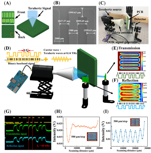 为了展示超构天线的6G太赫兹应用前景,论文还构建了一个以无线通信为基础、以成像为中心的成像通信一体化系统模型,并进行了功能验证。如图5所示,该模型中采用OOK调制太赫兹信号,通过对传统PCB板的非侵入式检测实验,证明了系统的透反射两种信号均能够清晰分辨亚波长尺度的PCB板电路传输线和空间结构,同时实现了成像通信一体化。