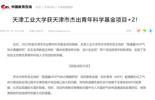 近年来,天津工业大学在天津市科学技术局和天津市教委的支持下,坚持推进有组织科研和青年科技人才队伍培养,本年度首次同时获批两项天津市杰出青年科学基金项目,体现了天津工业大学科技创新实力的进一步提升和青年科技人才队伍建设的深厚积累。