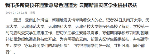 最近,云南山体滑坡、新疆地震灾情牵动着众人的心。记者24日从南开大学、天津大学、天津师范大学、天津医科大学、天津科技大学等多所高校了解到,学校第一时间启动受灾学生摸排工作,密切关注学生安危及需求,寒假期间学校专项临时困难补助紧急绿色通道将持续开放,为有需要的云南、新疆灾区学生提供帮扶,并喊话学生:学校“永远是同学们的温暖后盾”“始终与同学们在一起,共担风雨、同心前行”。