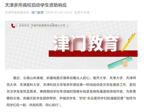 最近,云南山体滑坡、新疆地震灾情牵动着众人的心。南开大学、天津大学、天津师范大学、天津医科大学、天津科技大学等多所高校第一时间启动受灾学生摸排工作,密切关注学生安危及需求,寒假期间学校专项临时困难补助紧急绿色通道将持续开放,为有需要的云南、新疆灾区学生提供帮扶,并喊话学生:学校“永远是同学们的温暖后盾”“始终与同学们在一起,共担风雨、同心前行”。