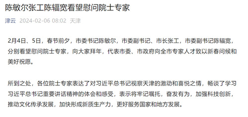 张工看望慰问中国科学院院士、南开大学副校长陈军,关心询问工作生活情况,致以新春祝福。他说,习近平总书记春节前夕亲临天津视察,对天津发展寄予殷切期望,为天津做好科技创新、产业创新和科创园区建设等工作指明前进方向、提供根本遵循、注入强大动力。院士专家是天津推进创新发展的宝贵战略资源,希望陈军院士发挥自身专业优势和学校金融、管理等学科人才优势,积极投身天开园建设发展等科教兴市各项工作。随后,张工看望慰问中国工程院院士、天津大学校长金东寒,就科技人才培育、科研成果转化等听取意见建议。他说,当前全市上下正在深入学习贯彻习近平总书记视察天津重要讲话精神,发挥科教资源丰富等优势,加快发展新质生产力。长期以来,金东寒院士和天津大学在实施国家重点科研项目、培养高水平人才、助力“十项行动”等方面作出了重要贡献,希望一如既往支持天津发展,推动更多成果从“实验室”上“生产线”。