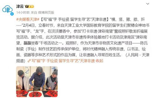#央媒看天津#【写“福”字手绘瓷留学生寻“艺”天津非遗】“横、竖撇捺、折....“2月4日,立春时节,来自天津工业大学国际教育学院的留学生们聚精会神地书写“福”字“龙”字,在淡淡墨香中,参加”打卡非遗·津彩南望”暨观照轩敬龙祈福展览活动。据介绍,此次活动是天津市非遗传承体验基地打卡活动及津南区”津彩南望,赢盖贺春”千场活动之一。观照轩,作为天津市非物质文化遗产项目一-陈氏制瓷(手绘)制作技艺的传承保护单位,将时代精神融入传统非遗,以书法、绘画、瓷器等多种艺术形式的作品为媒,让非遗融入寻常百姓生活。 (人民网-天津频道)