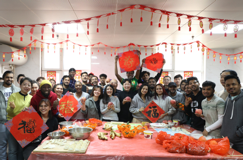上午11时,沈江书记一行来到北苑5号楼留学生公寓,和在校留学生一起包饺子,欢度佳节。师生们熟练地擀皮、放馅、对折、捏边,一个个玲珑精巧的饺子在十指翻飞间完成。现场师生们还挥毫泼墨写“福”字,一幅幅充满美好寓意的“福”字跃然纸上,寄托着大家对龙年美好的祝愿。