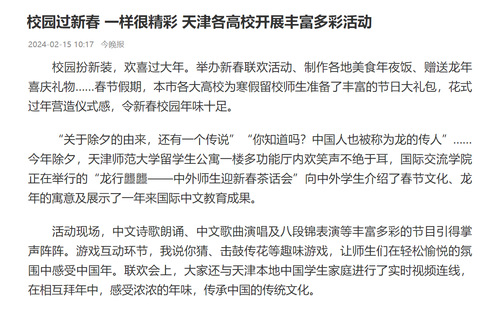 “关于除夕的由来,还有一个传说”“你知道吗?中国人也被称为龙的传人”……今年除夕,天津师范大学留学生公寓一楼多功能厅内欢笑声不绝于耳,国际交流学院正在举行的“龙行龘龘——中外师生迎新春茶话会”向中外学生介绍了春节文化、龙年的寓意及展示了一年来国际中文教育成果。