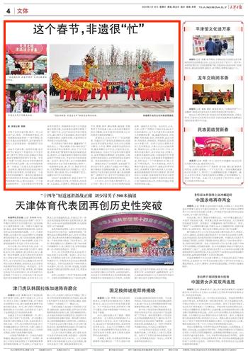 河北区“金龙腾北岸 新春中国年”天津之眼·津派活力市集,年货展卖、民俗表演、文艺演出、非遗展示、便民服务等应有尽有,歌舞、相声、舞龙舞狮、踩高跷、旱船等多个节目轮番上演,让前来逛市集的市民目不暇接,还有非遗项目现场展示让市民感受非遗的独特魅力。