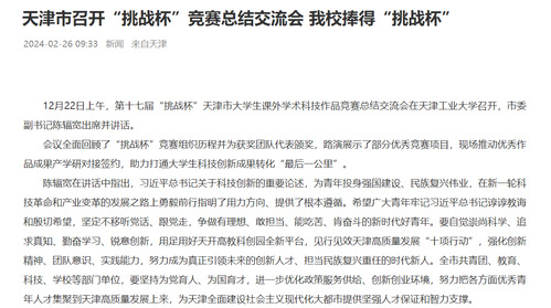 12月22日上午,第十七届“挑战杯”天津市大学生课外学术科技作品竞赛总结交流会在天津工业大学召开,市委副书记陈辐宽出席并讲话。