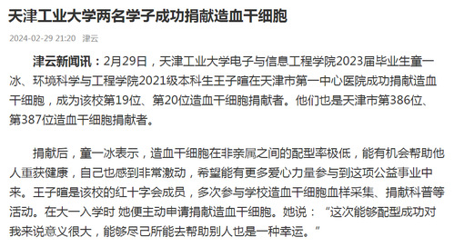 津云新闻讯:2月29日,天津工业大学电子与信息工程学院2023届毕业生童一冰、环境科学与工程学院2021级本科生王子暄在天津市第一中心医院成功捐献造血干细胞,成为该校第19位、第20位造血干细胞捐献者。他们也是天津市第386位、第387位造血干细胞捐献者。