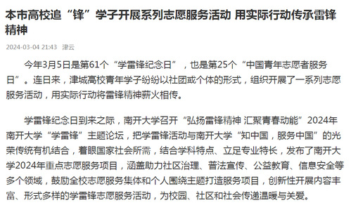 学雷锋纪念日到来之际,南开大学召开“弘扬雷锋精神 汇聚青春动能”2024年南开大学“学雷锋”主题论坛,把学雷锋活动与南开大学“知中国,服务中国”的光荣传统有机结合,着眼国家社会所需,结合学科特点、立足专业特长,发布了南开大学2024年重点志愿服务项目,涵盖助力社区治理、普法宣传、公益教育、信息安全等多个领域,鼓励全校志愿服务集体和个人围绕主题打造服务项目,创新性开展内容丰富、形式多样的学雷锋志愿服务活动,为校园、社区和社会传递温暖与关爱。