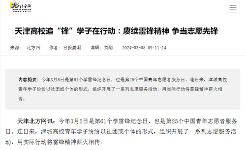 天津北方网讯:今年3月5日是第61个学雷锋纪念日,也是第25个中国青年志愿者服务日。连日来,津城高校青年学子纷纷以社团或个体的形式,组织开展了一系列志愿服务活动,用实际行动将雷锋精神薪火相传。