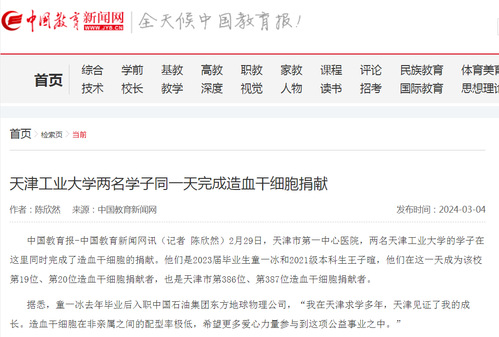 中国教育报-中国教育新闻网讯(记者 陈欣然)2月29日,天津市第一中心医院,两名天津工业大学的学子在这里同时完成了造血干细胞的捐献。他们是2023届毕业生童一冰和2021级本科生王子暄,他们在这一天成为该校第19位、第20位造血干细胞捐献者,也是天津市第386位、第387位造血干细胞捐献者。