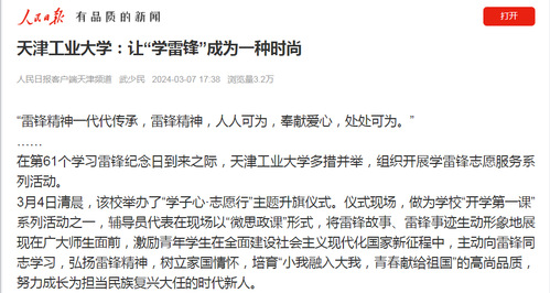 为了大力宣传雷锋事迹和校内外涌现出的新时代雷锋式模范人物,不断深化“雷锋精神永不过时”的思想观念,扩大学雷锋活动的影响力,营造“人人学雷锋、人人做雷锋”的浓厚氛围,3月1日,天津工业大学特邀“时代楷模”“全国道德模范”“最美奋斗者”曲建武教授来学校作报告。该校材料科学与工程学院一名辅导员谈到,“曲老师的个人事迹不仅让我能够在以后工作中获得源源不断的力量,对于如何做好新时代大学生思想政治工作也有了更深的心得体会。这场‘先进人物进校园’活动为我校学雷锋活动的开展增添了亮丽色彩。”