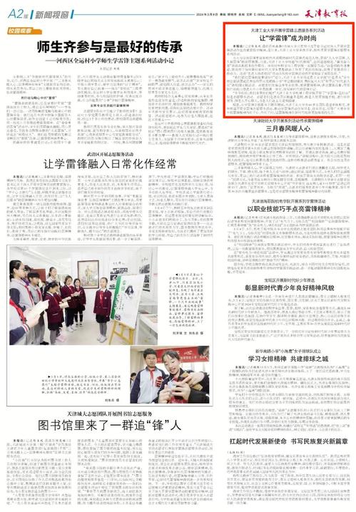 为大力宣传雷锋事迹和校内外涌现的新时代雷锋式模范人物,营造“人人学雷锋、人人做雷锋”的浓厚氛围,日前,天津工业大学特邀“时代楷模”、全国道德模范、“最美奋斗者”曲建武教授来校作报告。该校材料科学与工程学院一名辅导员说:“曲老师的先进事迹,使我对于如何做好新时代大学生思想政治工作有了更深的体悟,获得了更强劲的工作动力。这场‘先进人物进校园’活动为我校学雷锋活动的开展增添了亮丽色彩。”