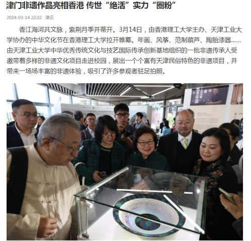 香江海河共文脉,紫荆月季并蒂开。3月14日,由香港理工大学主办、天津工业大学协办的中华文化节在香港理工大学拉开帷幕。年画、风筝、范制葫芦、陶胎漆器……由天津工业大学中华优秀传统文化与技艺国际传承创新基地组织的一批非遗传承人受邀带着多样的非遗文化项目走进校园,展出一个个富有天津民俗特色的非遗项目,并带来一场场丰富的非遗体验,吸引了许多参观者驻足拍照。