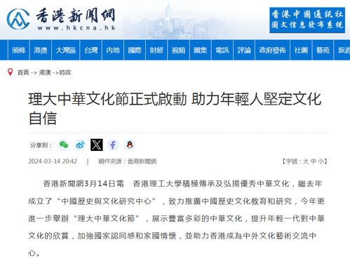 香港新聞網3月14日電 香港理工大學積極傳承及弘揚優秀中華文化,繼去年成立了“中國歷史與文化研究中心”,致力推廣中國歷史文化教育和研究,今年更進一步舉辦“理大中華文化節”,展示豐富多彩的中華文化,提升年輕一代對中華文化的欣賞,加強國家認同感和家國情懷,並助力香港成為中外文化藝術交流中心。