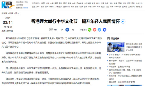 新华社香港3月14日电(记者张雅诗)香港理工大学(简称“理大”)14日在理大校园举行中华文化节启动仪式,活动旨在提升年轻一代对中华文化的热爱,加强他们的国家认同感和家国情怀,并助力香港成为中外文化艺术交流中心。
