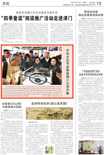 昨天,由香港理工大学主办、天津工业大学协办的中华文化节在香港理工大学拉开帷幕。本次中华文化节从即日起至3月27日将举办为期两周的艺术作品展,展览以“香江海河共文脉,紫荆月季并蒂开”为题,由天津工业大学中华优秀传统文化与技艺国际传承创新基地邀请八位合作共建单位的艺术家展出其作品,作品包括天津工业大学郑勇工作室、津门非遗三绝(泥人张世家、风筝魏、玉成号杨柳青年画)、合真中华药香、观照轩彩绘陶瓷、葫芦庐匏器、乐器张等国家级、省市级的非物质文化遗产展品。图为现场观众饶有兴致地参观中华文化节作品展。