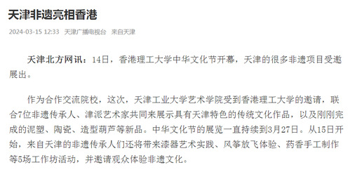 天津非遗亮相香港天津北方网讯:14日,香港理工大学中华文化节开幕,天津的很多非遗项目受邀展出。作为合作交流院校,这次,天津工业大学艺术学院受到香港理工大学的邀请,联合7位非遗传承人、津派艺术家共同来展示具有天津特色的传统文化作品,以及刚刚完成的泥塑、陶瓷、造型葫芦等新品。中华文化节的展览一直持续到3月27日。从15日开始,来自天津的非遗传承人们还将带来漆器艺术实践、风筝放飞体验、药香手工制作等5场工作坊活动,并邀请观众体验非遗文化。