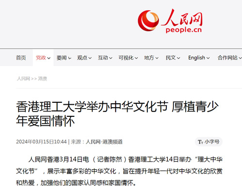 人民网香港3月14日电 (记者陈然)香港理工大学14日举办“理大中华文化节”,展示丰富多彩的中华文化,旨在提升年轻一代对中华文化的欣赏和热爱,加强他们的国家认同感和家国情怀。