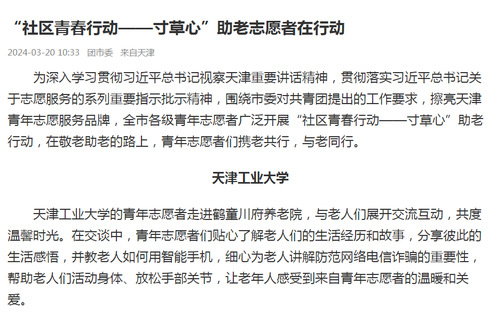 为深入学习贯彻习近平总书记视察天津重要讲话精神,贯彻落实习近平总书记关于志愿服务的系列重要指示批示精神,围绕市委对共青团提出的工作要求,擦亮天津青年志愿服务品牌,全市各级青年志愿者广泛开展“社区青春行动——寸草心”助老行动,在敬老助老的路上,青年志愿者们携老共行,与老同行。