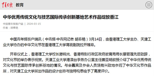 中国青年报客户端讯(中青报·中青网记者 胡春艳)3月14日,由香港理工大学主办、天津工业大学协办的中华文化节在香港理工大学蒋震剧院拉开帷幕。